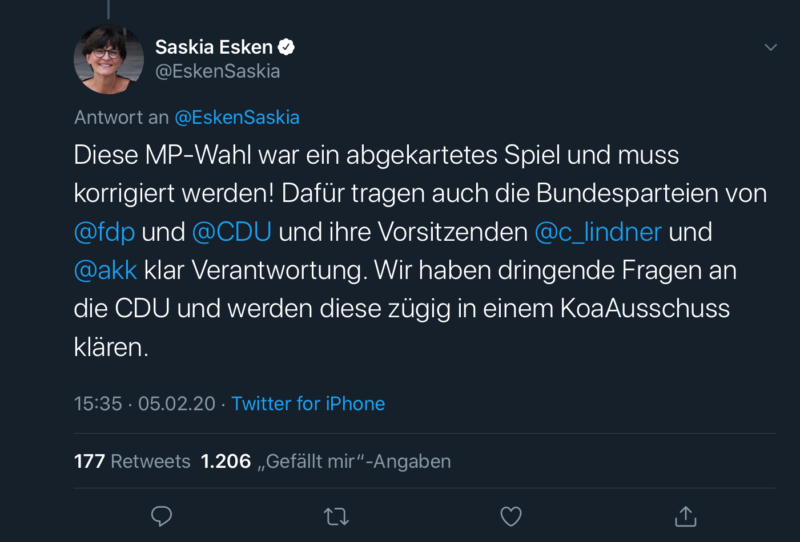 Zum anderen ist zu ver­muten, dass ger­ade denen eine Neuwahl des Thüringer Land­tags am Ende am teuer­sten zu ste­hen kommt, die sie am lautesten fordern. Beispiel­haft deshalb ein Tweet von Sask­ia Esken (SPD) bei Twit­ter, in dem sie die Kor­rek­tur der Wahl fordert und zu diesem Zweck auch die Berlin­er GroKo in Frage stellt: