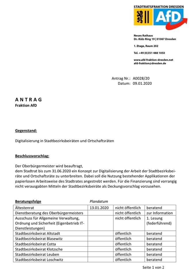 Als Stadtbezirksbeiräte können wir aufgrund unserer Zuständigkeiten nicht einfach beschließen, dass wir für unsere Arbeit auch die Digitalisierung wollen. Das geht nur im Stadtrat. Also musste ein Antrag her, den wir als AfD-Fraktion dann auch erarbeitet und in den Geschäftsgang eingebracht haben. Der sollte natürlich in allen Stadtbezirksbei- und Ortschaftsräten beraten werden.